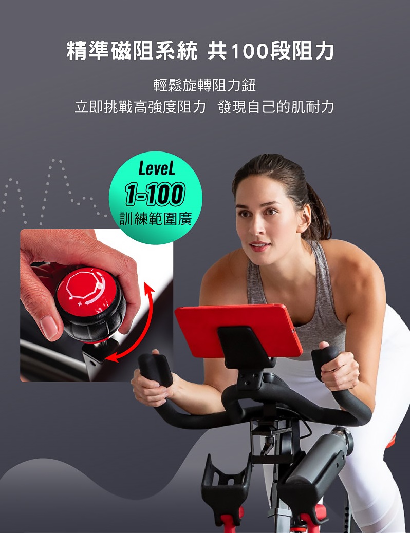 100段磁控阻力,精準微調,挑戰高強度運動,激發你的最強肌耐力。